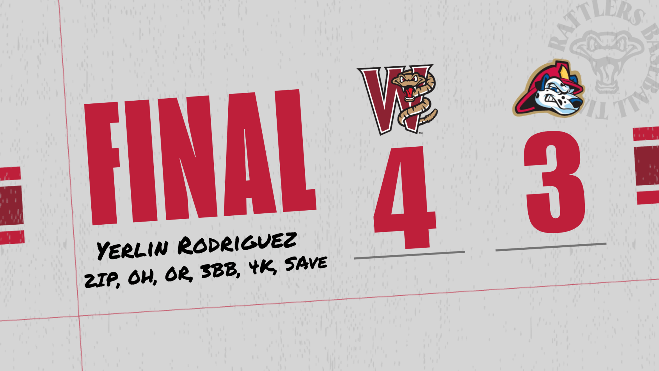 Rodriguez walked the first two batters on nine pitches. Another botched double play ball loaded the bases with no outs. Back-to-back strikeouts and a grounder near third for a force play ended the inning with the Rattlers still up by one run.