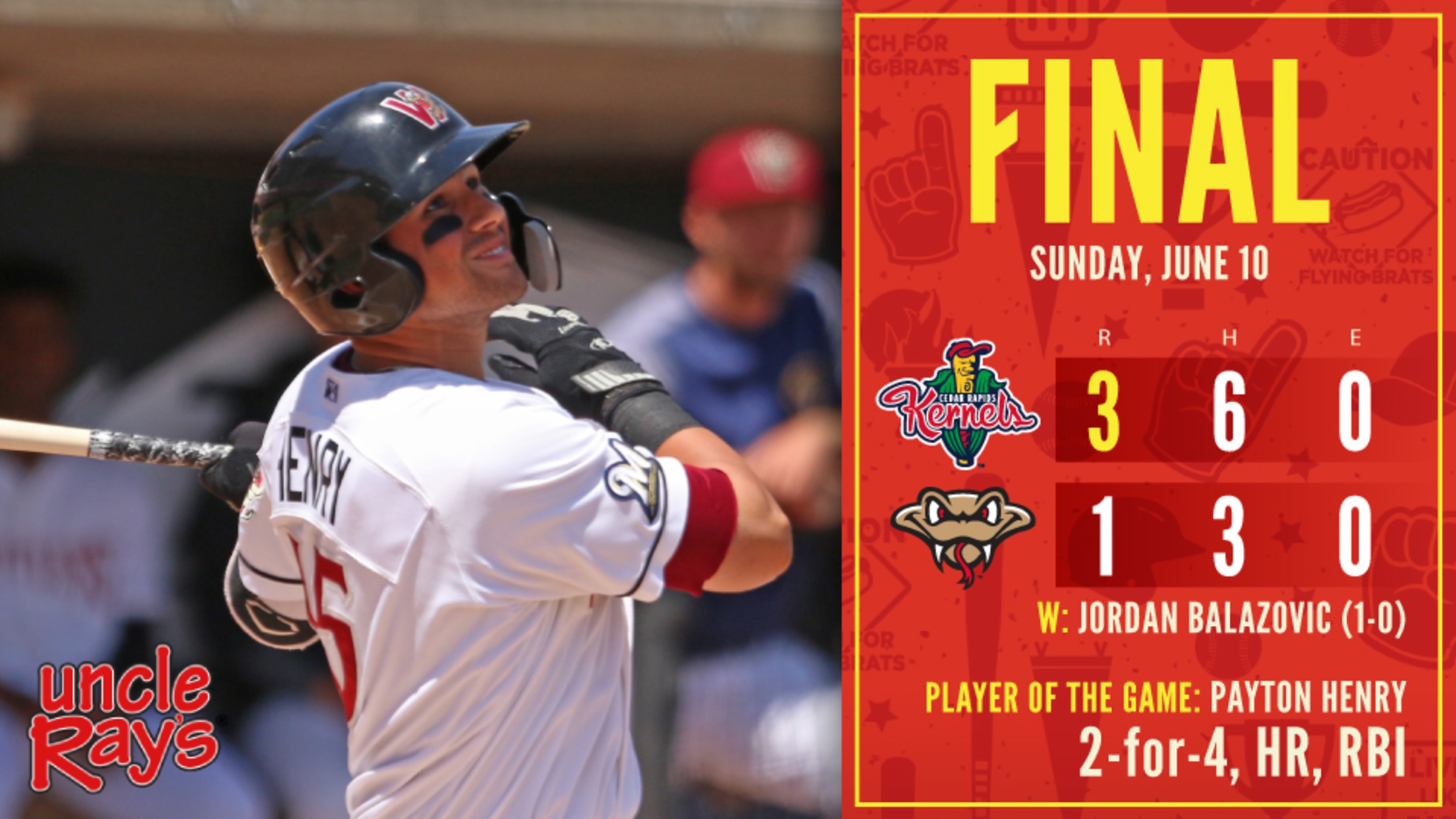 GRAND CHUTE, WI - The Wisconsin Timber Rattlers saw their six-game winning streak come to an end on Monday afternoon. The Cedar Rapids Kernels beat the Rattlers 3-1 as three Kernels pitchers held the Rattlers to three hits in the game at Neuroscience Group Field at Fox Cities Stadium.The Kernels
