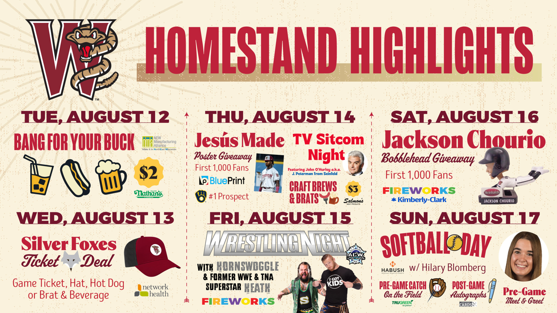 THURSDAY, AUGUST 14 at 6:40pm; TV Sitcom Night with John O’Hurley; Jesús Made Picture Giveaway sponsored by Blue Print Service Company; Stand Up to Cancer Night; Craft Brews & Brats presented by Fox River Brewing Company and The Score: The sun sets over the verdant outfield, casting a warm glow over our hallowed ballpark. Amidst the smell of freshly grilled bratwurst, an event of unparalleled sophistication unfolds. Step into a world where elegance meets the earthy charm of America's pastime. The man, the myth, the legend, Mr. John O'Hurley – J. Peterman himself from Seinfeld, graces us with his presence for a pregame Meet & Greet in the Fox Club with one picture or autograph per person. O’Hurley, his voice, a velvet echo in the annals of television history, will also host a post-game round of Seinfeld trivia in the Fox Club as part of this ticket package. Blue Print Service Company is sponsoring a collectible 8-1/2” x 11” photo of Jesús Made, the #1 prospect in the Brewers system for the first 1,000 fans to attend this game. Fans who are of legal drinking age may purchase any 16-ounce craft beer for $3 at this game. All fans can purchase a Salmon’s Meat Products brat for $3 thanks to Fox River Brewing Company and The Score. The Timber Rattlers invite you to participate in Stand Up To Cancer during this game, too.