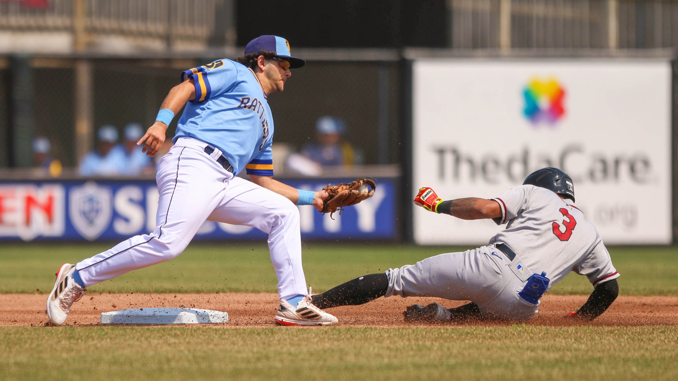 Ethan Murray is about to tag out Herard Gonzalez on a stolen base attempt in the first inning of the game on April 24, 2022. (Wisconsin Timber Rattlers)
