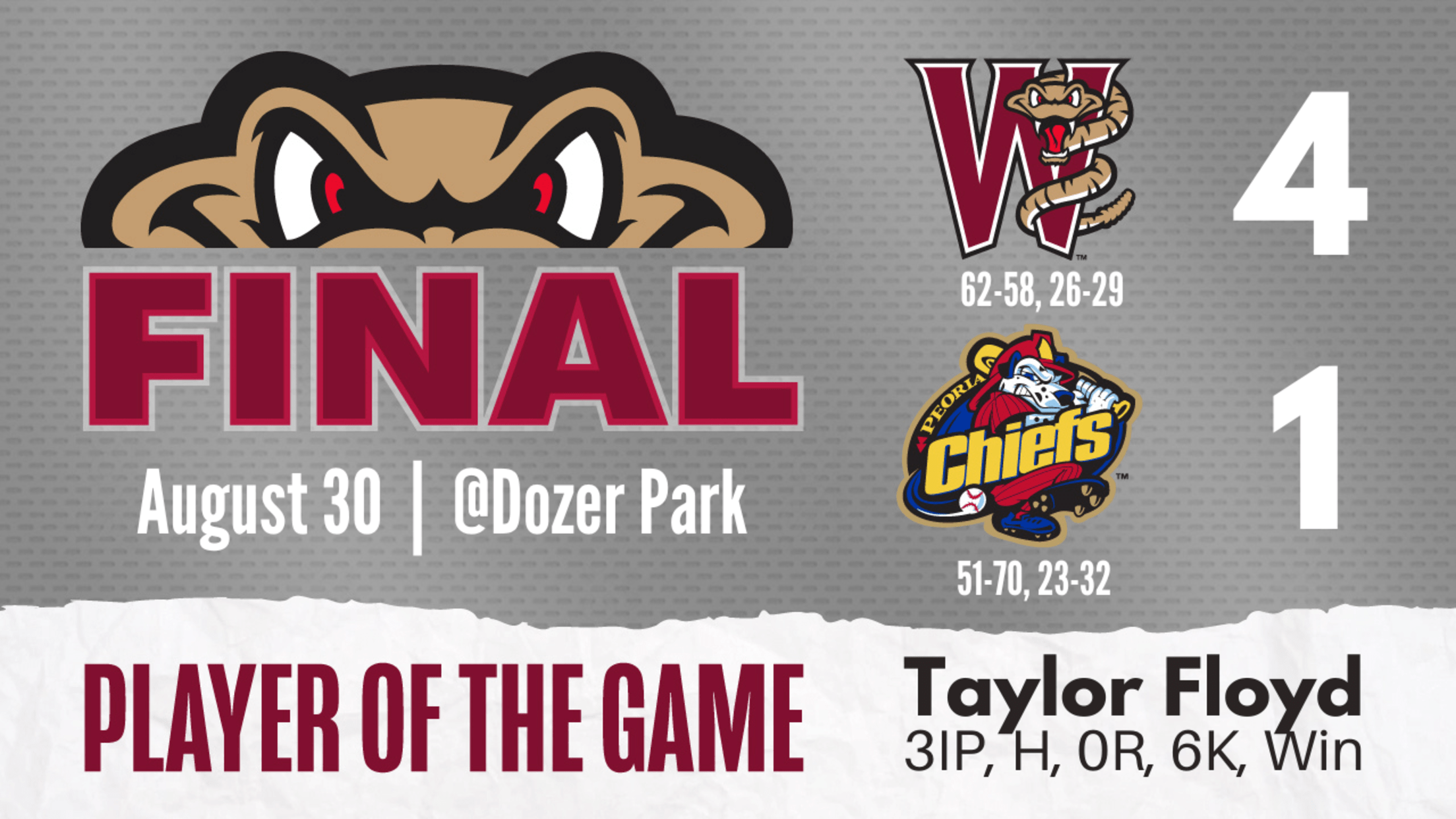 Floyd worked a scoreless seventh and a scoreless eighth while racking up six strikeouts. He would be credited with the win, his third of the season with the Timber Rattlers.