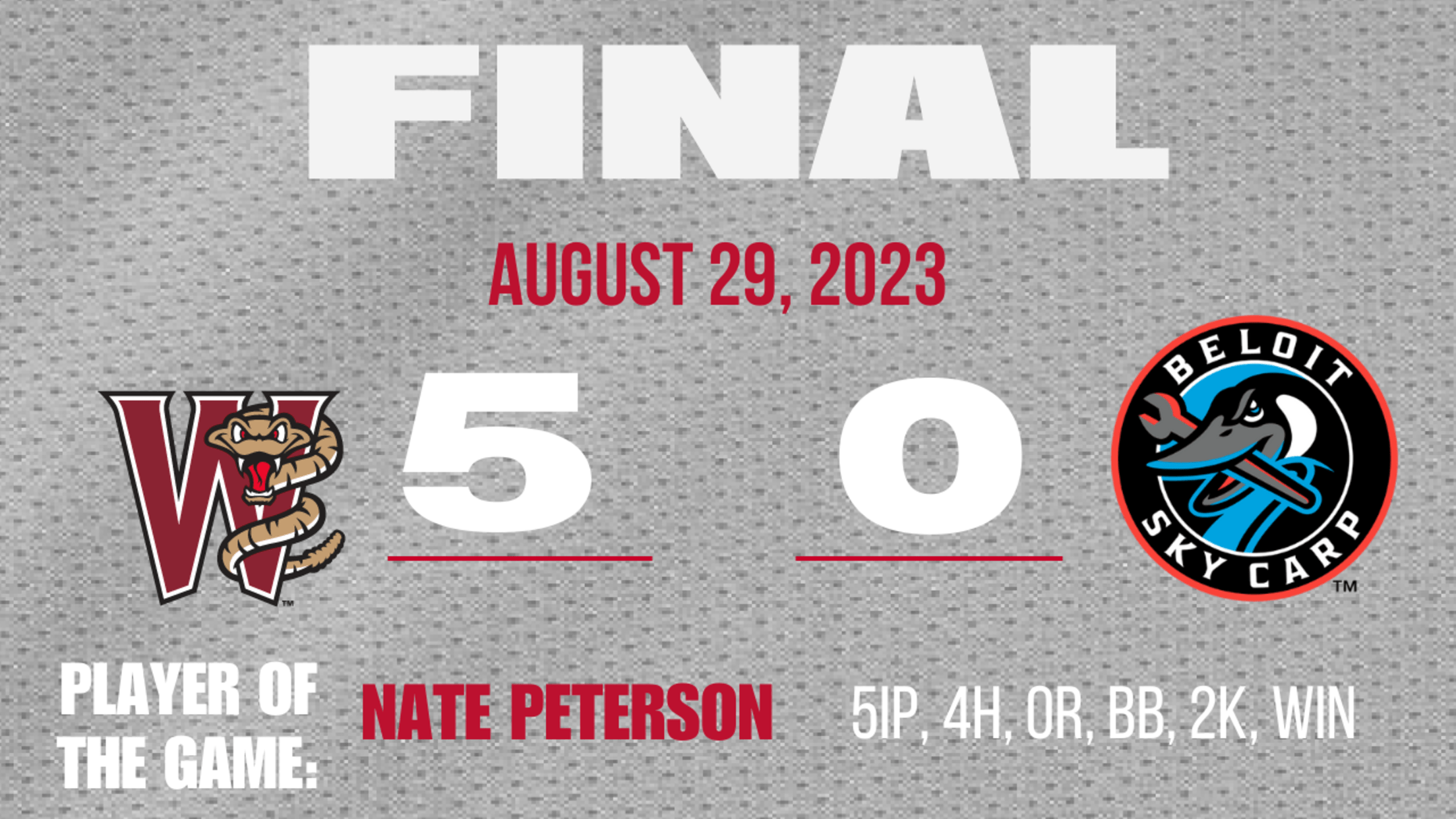BELOIT, WI – The Wisconsin Timber Rattlers held the Beloit Sky Carp to 0-for-10 with runners in scoring position while delivering some key hits of their own to earn a 5-0 win over their in-state rivals Tuesday night at ABC Supply Stadium. Nate Peterson won his second straight start with five scoreless frames to lead the Rattlers to their third win in a row.