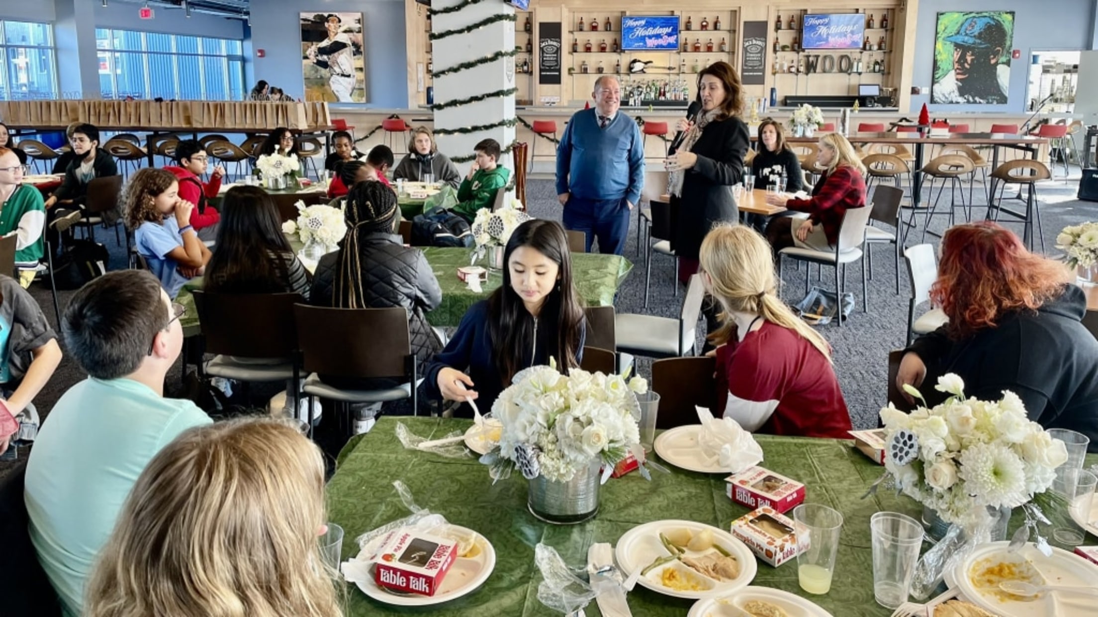 Estudiantes del cuadro de honor de la Escuela Intermedia Burncoat disfrutan de un almuerzo en el club DCU de Polar Park