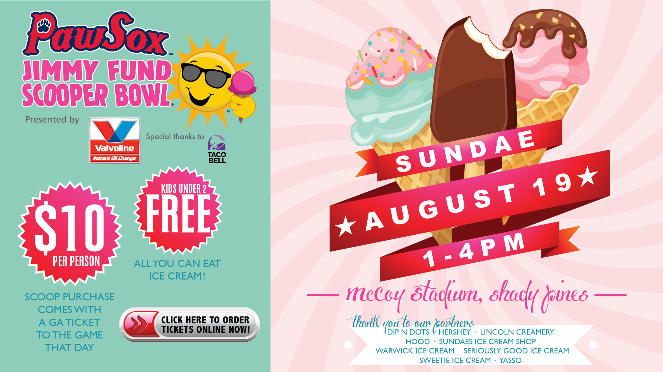 The Pawtucket Red Sox will host the inaugural "Jimmy Fund Scooper Bowl Pawtucket" at McCoy Stadium this Sunday, August 19, from 1-4 p.m., when the PawSox play the Durham Bulls. Game time is 1:35 p.m. Proceeds go directly to the Jimmy Fund, which benefits adult and pediatric cancer care and