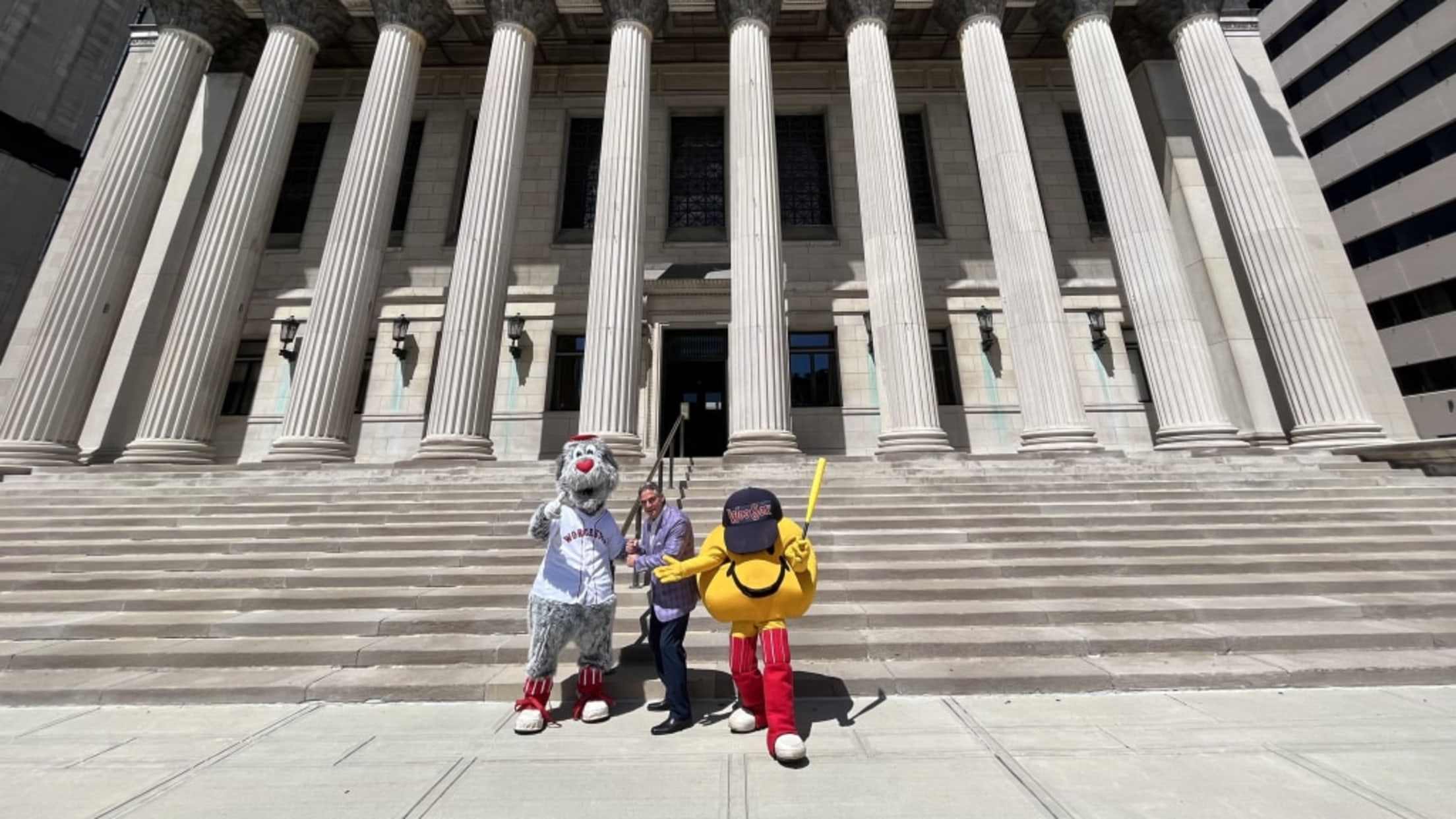 Al día siguiente formé parte de otro viaje, esta vez a unas dos horas de distancia a la ciudad de Springfield. Smiley, Woofster, el embajador jefe Rick Medeiros, un compañero interno, y yo nos metimos en la camioneta WooSox y llegamos al Ayuntamiento de Springfield, donde fuimos recibidos por nada menos que el propio alcalde, el honorable Domenic Sarno. Tomamos algunas fotos, y luego nuestro grupo visitó el Museo Dr. Seuss y el Salón de la Fama del Baloncesto Naismith Memorial. Si alguien se lo preguntaba, mi pie no es del mismo tamaño que el de LeBron, pero el de Smiley podría haber estado cerca.