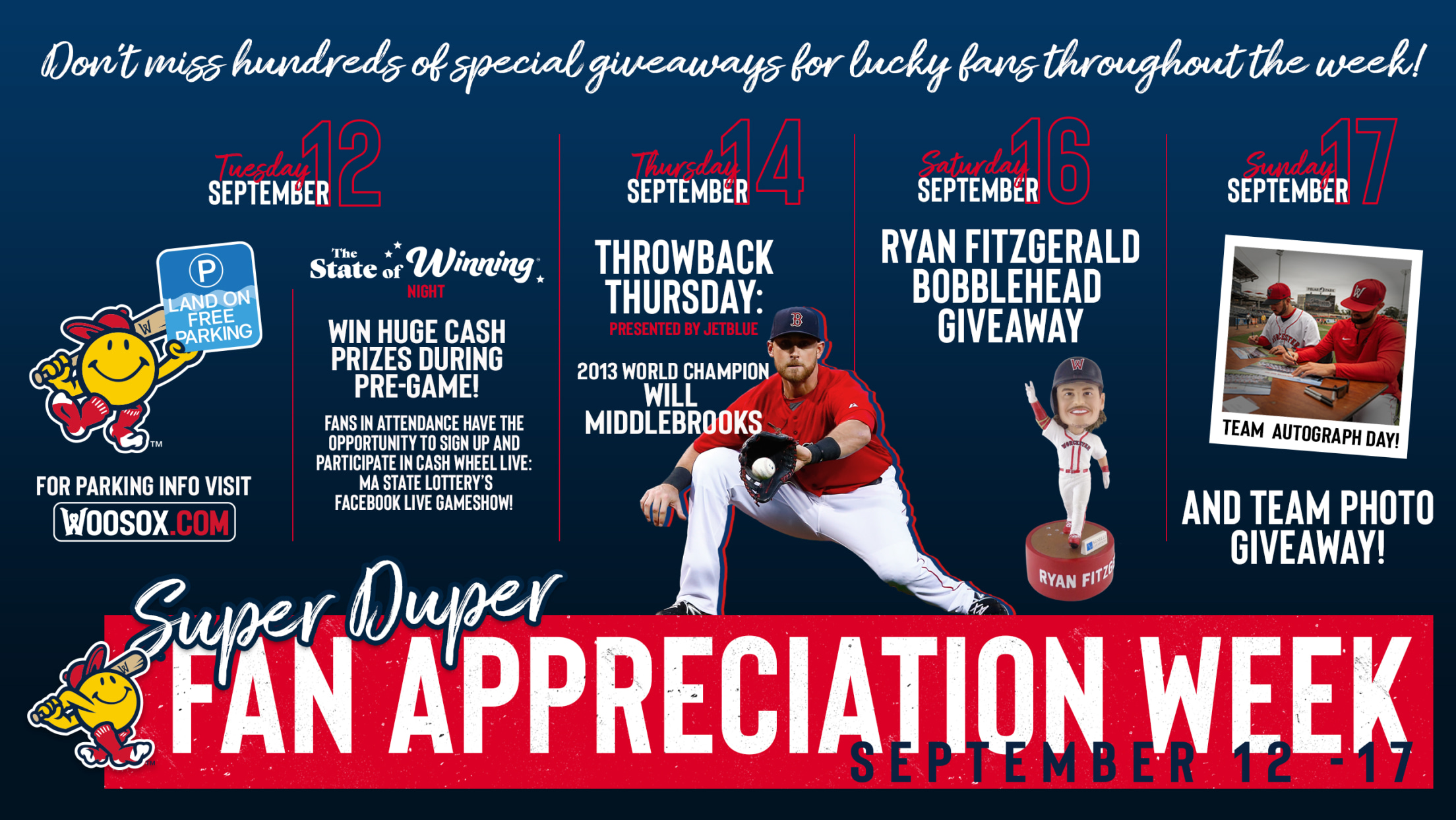 On the final “Throwback Thursday” September 14, presented by JetBlue, fans can meet 2013 World Series champion Will Middlebrooks in the Sherwood’s Diner at the Summit Street Fair during innings 3-6 and take photos with the 2013 World Series trophy.