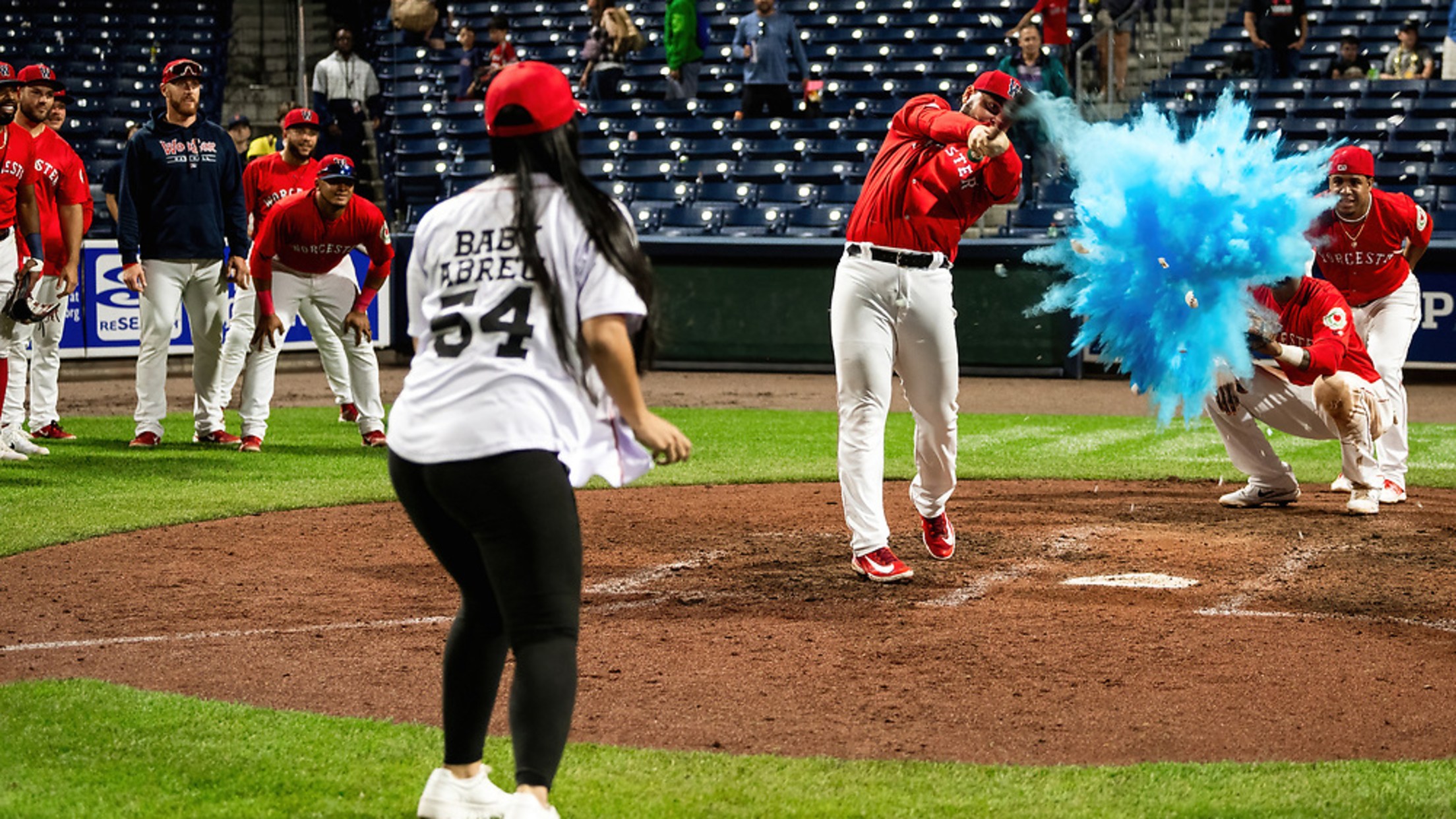 Abreu se colocó en el plato y su esposa realizó el esperado lanzamiento, con el swing, una estela de polvo azul inundó el ambiente seguido de una algarabía de sorpresa y felicidad pura. Todo el equipo incluidos el manager Chad Tracy y el coach de bateo, Rich Gedman felicitaron a la pareja y regalaron imágenes que quedaran para la posteridad en la historia de Polar Park y los WooSox.
