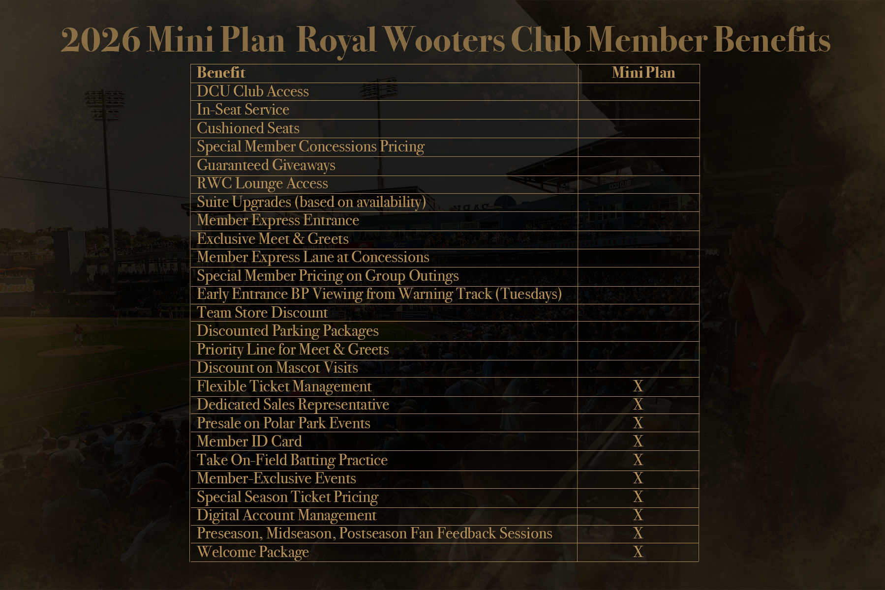 Starting at $210 per seat. Mini Season Memberships offer great seats to 10 great games, flexibility to exchange games to best fit your schedule, and access to limited member-exclusive events such as Member Batting Practice. Two Mini Season Membership options are available now: the Fireworks Plan featuring the first 10 fireworks shows of the season, and the Weekend Plan featuring a mix of Saturdays and Sundays throughout the 2026 season.