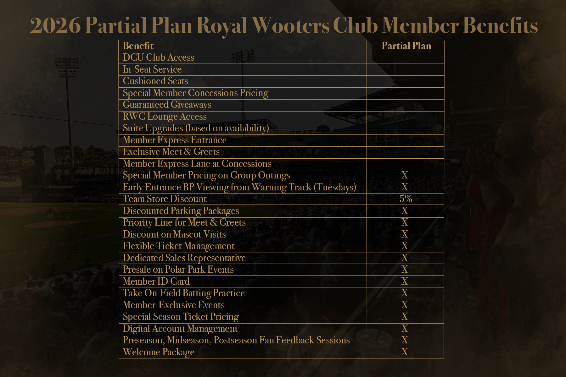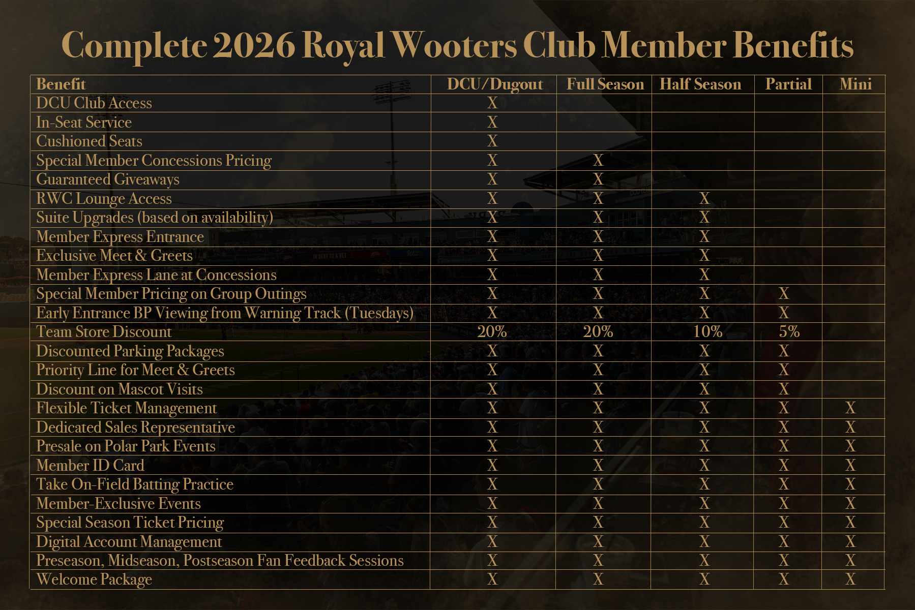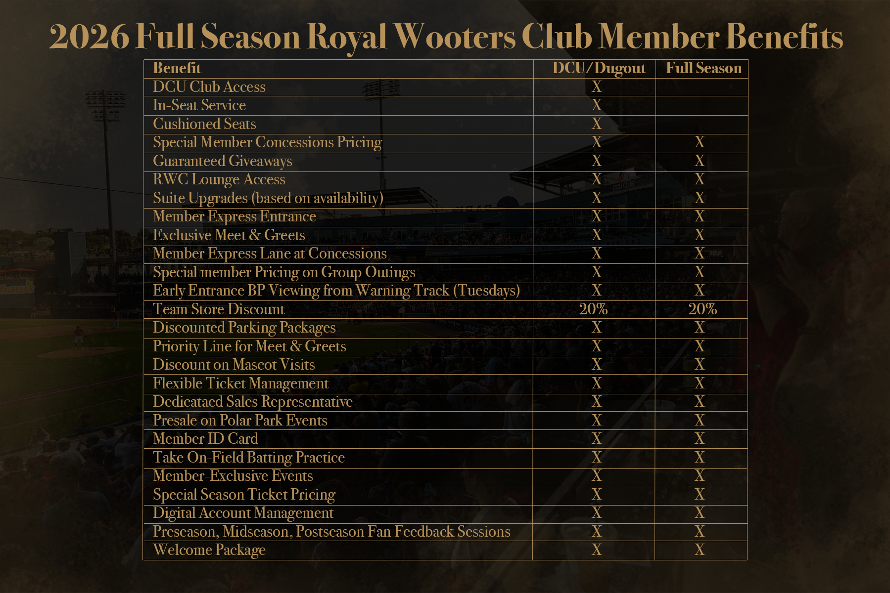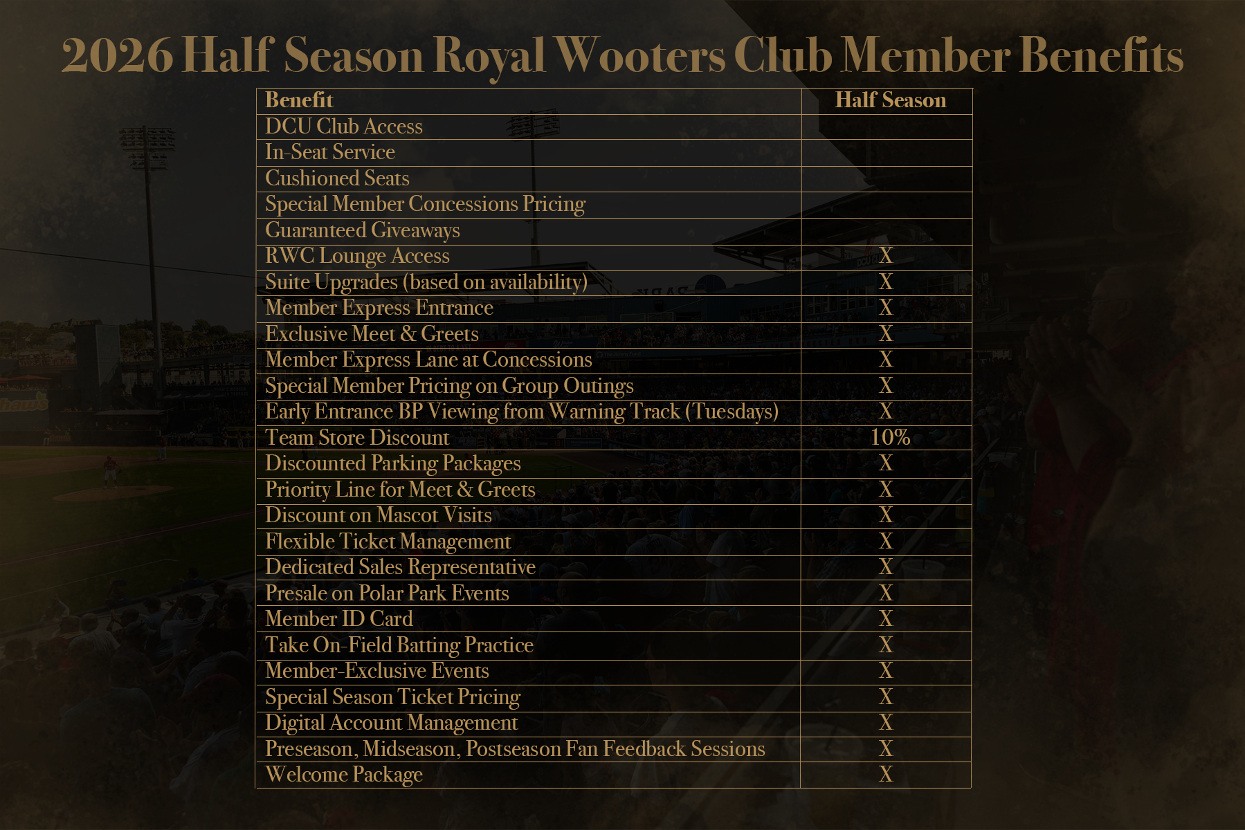 Starting at $727 per seat. Half Season Memberships include 3 games for each homestand in your choice of either Tue/Thur/Sat (Plan A), Wed/Fri/Sun (Plan B), or Fri/Sat/Sun (Plan C). Half-season members can take advantage of a member express entrance, member express lines at concessions, access to the Royal Wooters Club member lounge, and more!